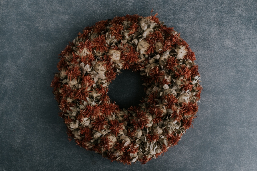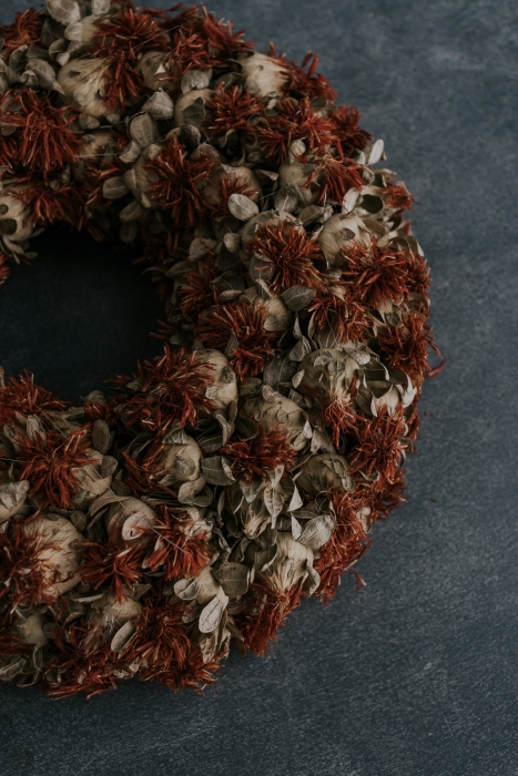 Az ár a képen látható koszorút tartalmaz. A koszorú szárított Sáfrányos szeklicéből készül. Tartós dekoráció.