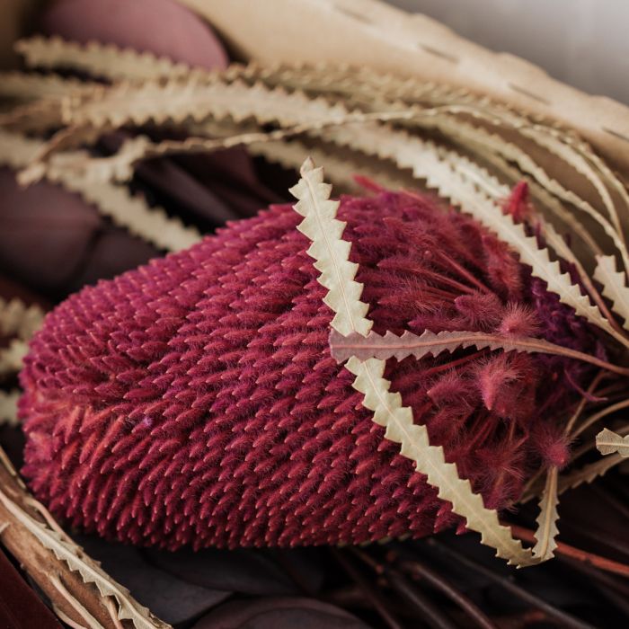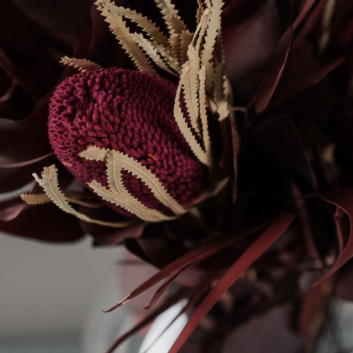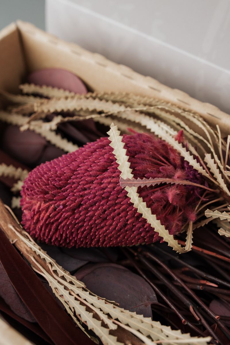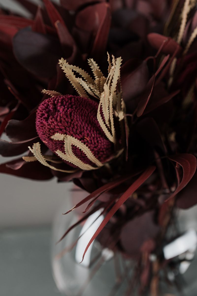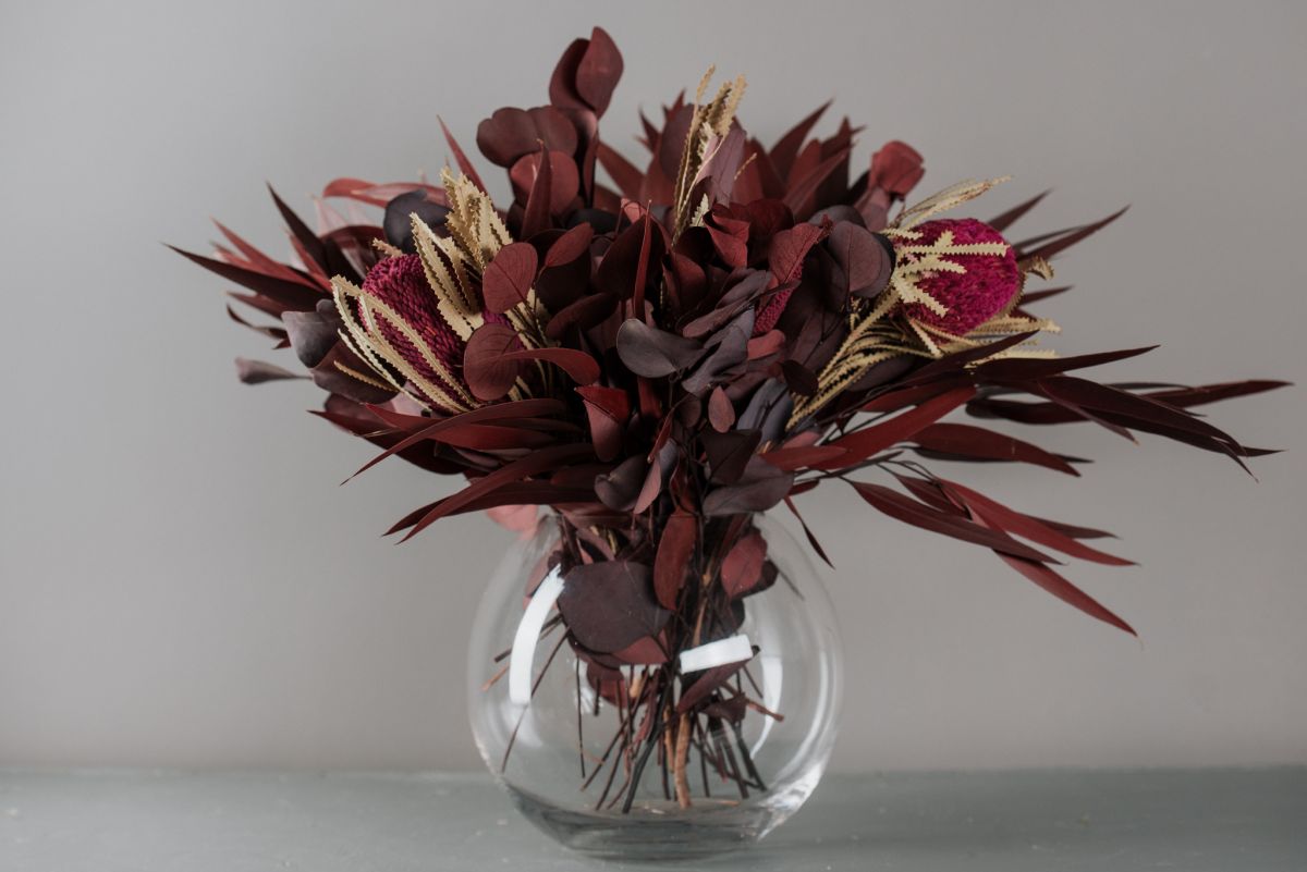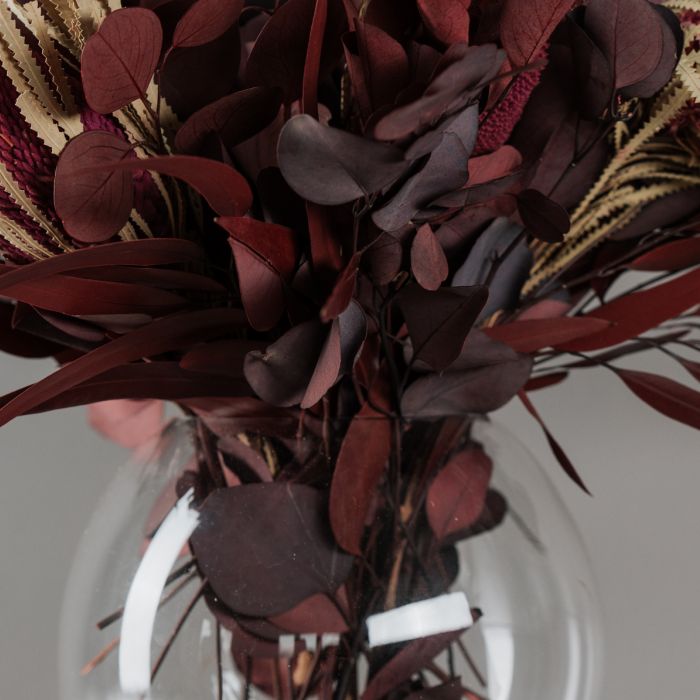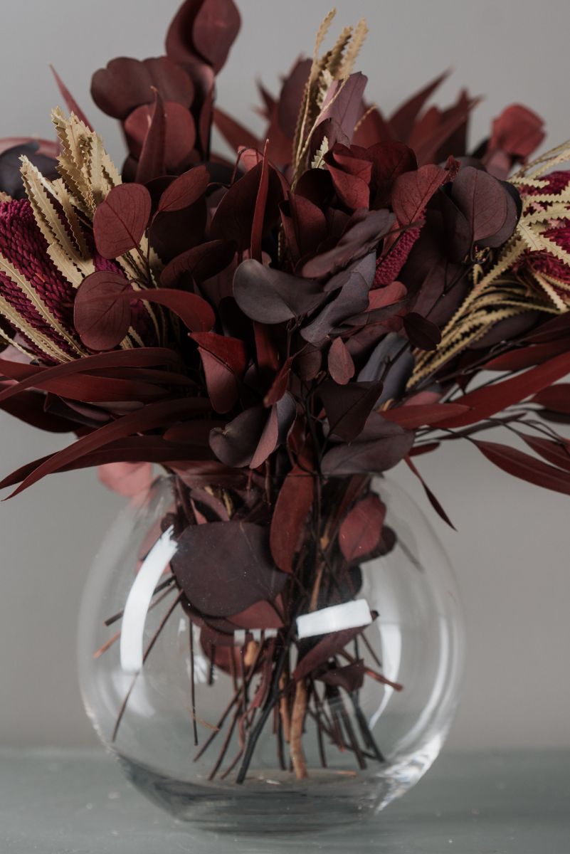 A csokor tartósított Eukaliptuszokból és szárított Proteából készült.