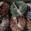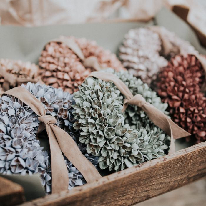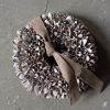 A koszorút bézs bársony szalaggal díszítjük, natúr dobozba csomagoljuk így ajándékozásra is alkalmas.